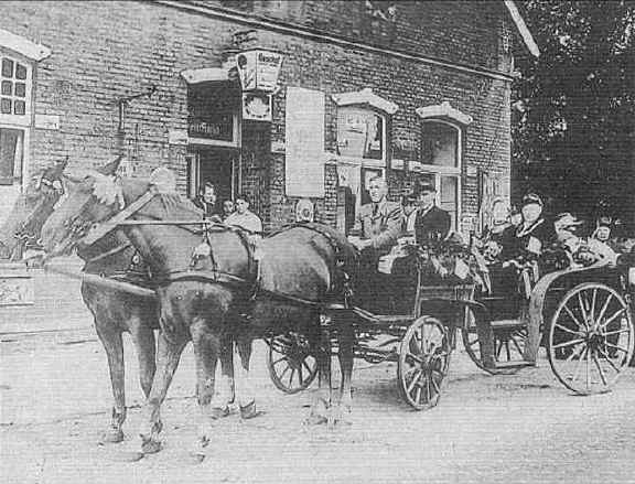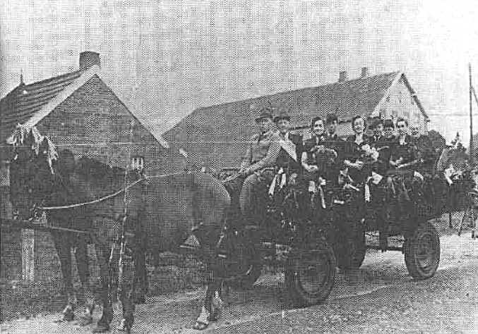 1950 wurde der Schützenverein Steenfelde gegründet, 1951 fand das erste Königsschießen statt. Als Sieger ging Hermann Müller (Bildmitte) hervor und wurde daraufhin mit dem Pferdewagen durch den Ort kutschiert. |